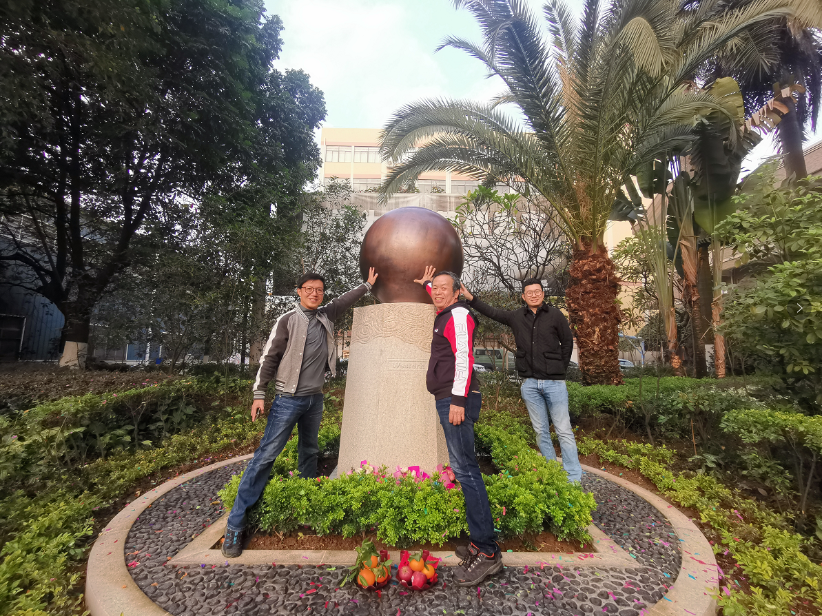 随着礼炮声和掌声欢呼声的响起,承安的董事长周腾芳先生、总经理周建新先生、副总经理岑国明先生揭开了覆盖着这颗直径1米的大铜球的红布,承安的新地标“威士顿金球”正式落成。